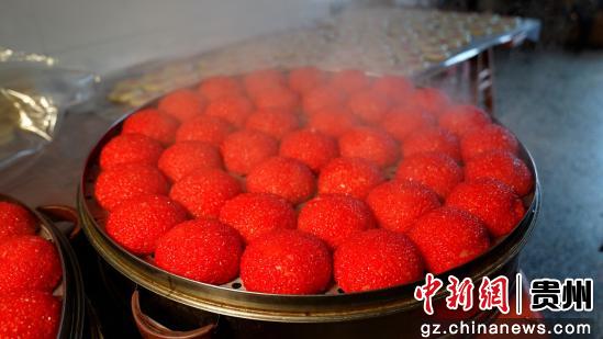 在小屋里,姚燕揉着粑团,等份分团,姚兰珍则为粑团滚红米“穿红衣”,随后便是上蒸笼蒸熟。屋里屋外烟火袅袅,灶台里的柴火噼里啪啦烧得正旺,一个多小时的蒸煮后,红彤彤、圆滚滚的红粑便做好了。打开蒸笼,香飘四溢、色泽诱人,拿起一个,蘸着白糖,咬上一口软糯香甜,回味无穷,儿时的年味也涌上心头。