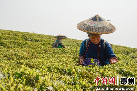 3月27日,茶农在贵州省铜仁市松桃苗族自治县正大乡茶园采收春茶。申逸恺 摄