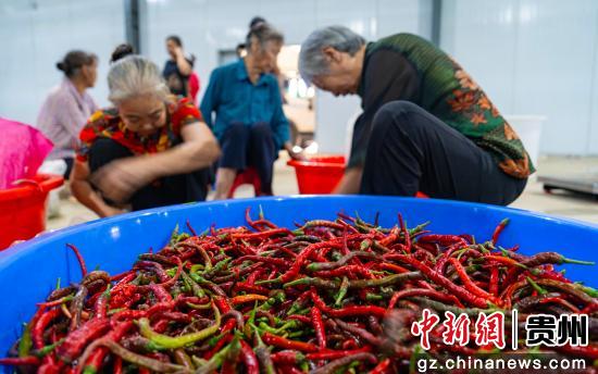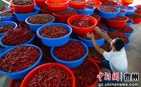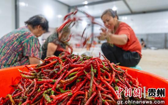 8月19日,在贵州省铜仁市万山区鱼塘乡大龙村辣椒生产加工厂内,辣椒喜获丰收,工人们忙着分拣、清洗、加工辣椒,一派红火景象。