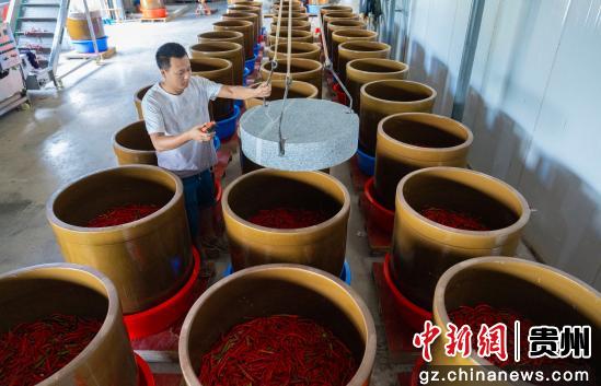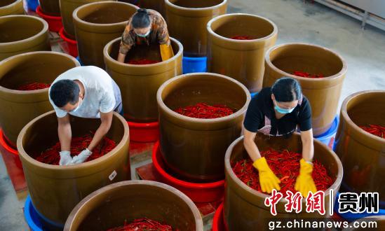 8月19日,工人在贵州省铜仁市万山区鱼塘乡大龙村辣椒加工厂内加工辣椒。叶顺强 摄