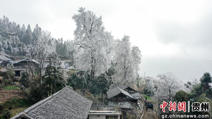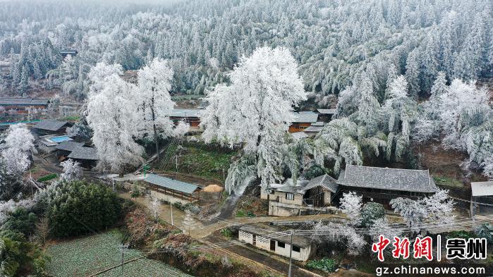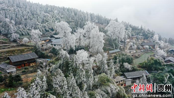 1月23日,贵州省江口县德旺土家族苗族乡坝梅村迎来雾凇美景。受低温天气影响,村庄周边山林、树木披上晶莹冰挂,与青山、村舍相互映衬,勾勒出一幅静谧清新的冬日画卷。