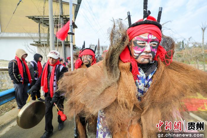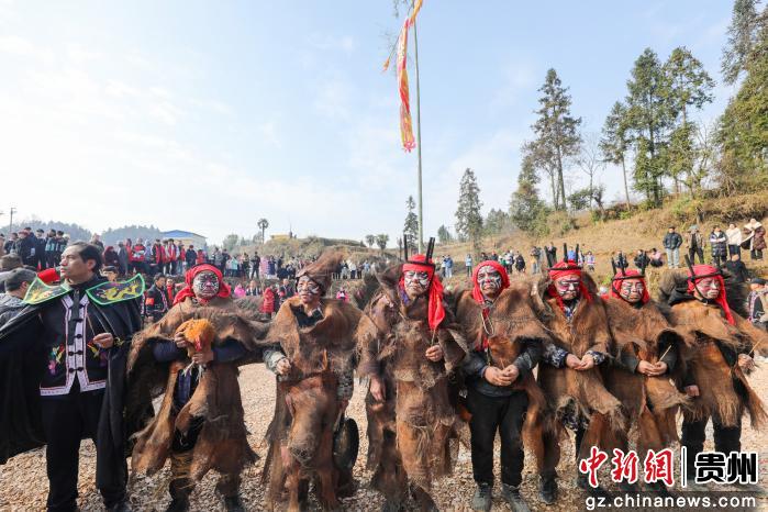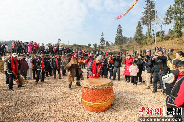 2月8日,苗族同胞在贵州江口县民和镇四宝村载歌载舞,欢庆苗年。李鹤 摄