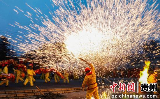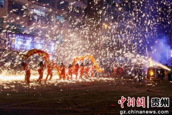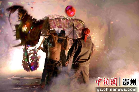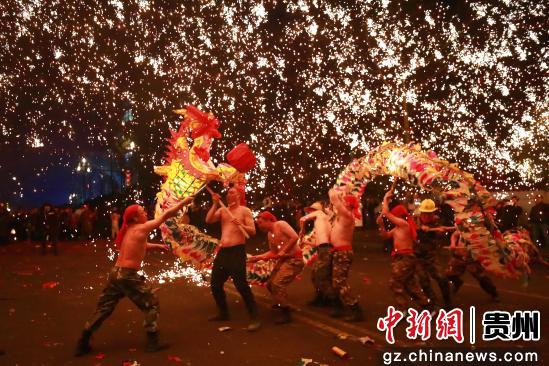 图为舞龙队伍在遵义市播州区三岔镇铁花中表演舞龙。李仁军 摄