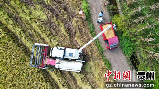 中新网贵州新闻9月19日电(白青青 安全益 田甜 杨益) 金秋时节,余庆县松烟镇中乐村的2500亩稻田里,金黄的稻穗随风摇曳,一台台搭载GPS系统的联合收割机穿梭其间,轰鸣声与农户的笑声交织在一起,一幅机械化丰收的画卷正徐徐展开。作为全省稻油轮作示范点,近年来,中乐村依托良种良法与智慧农机,不仅实现水稻高效收割,更为后续油菜种植筑牢基础,让“粮袋子”更稳、“菜篮子”更丰。