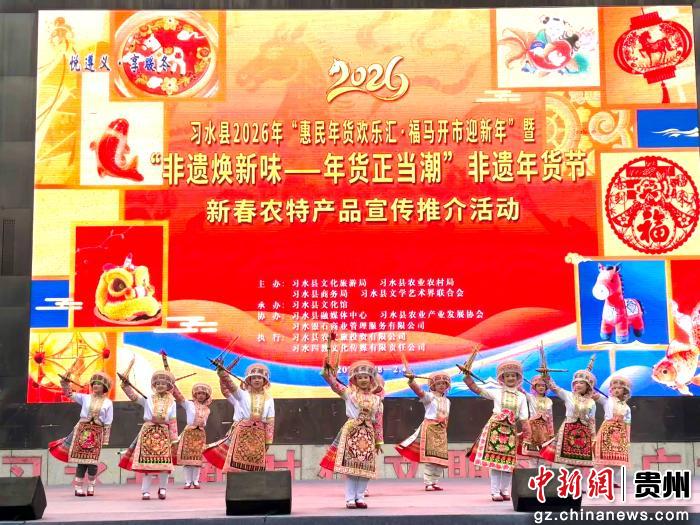 中新网贵州新闻1月29日电(刁苓沙 罗金)腊月逢盛会,非遗聚年味。1月28日,“悦遵义·享暖冬”习水县2026年“惠民年货欢乐汇·福马开市迎新年”暨“非遗焕新味——年货正当潮”非遗年货节在希望城时代广场正式拉开帷幕。本次活动融合非遗展示、文艺展演、年货促销、民俗体验于一体,为市民打造一个充满传统文化气息与温暖年味的新春购物盛宴。