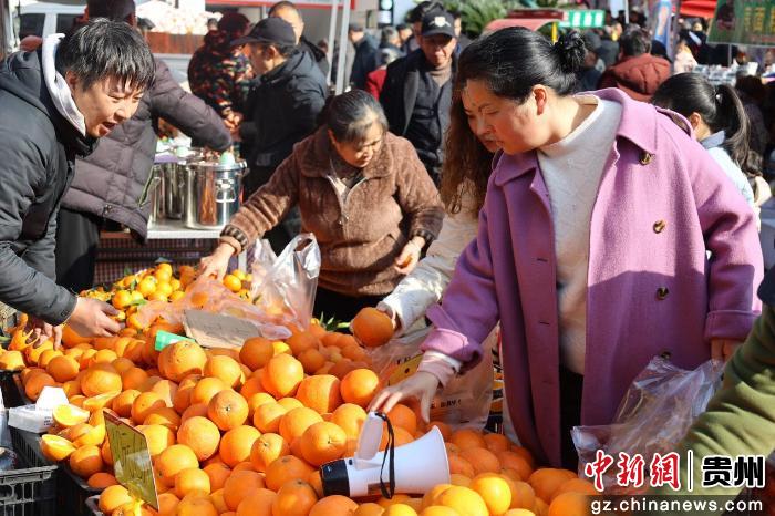 集市上,挂在摊位前的香肠色泽油亮,肥瘦相间的腊肉泛着琥珀色的光泽,经过柴火慢熏的肉香穿透力十足;蒸锅中的扣碗冒着腾腾热气,肥瘦均匀的腊五花肉码得整齐,铺上香辣爽口的盐菜,经旺火蒸制后肉香与酱香深度融合,是遵义人过年餐桌上不可或缺的硬菜。来自桐梓的农户曹阳装着满车新鲜橘子赶来。“这些橘子都是自家果园种的,赶在年前拉来集市,这边热闹些,可以卖出更多。”曹阳说。