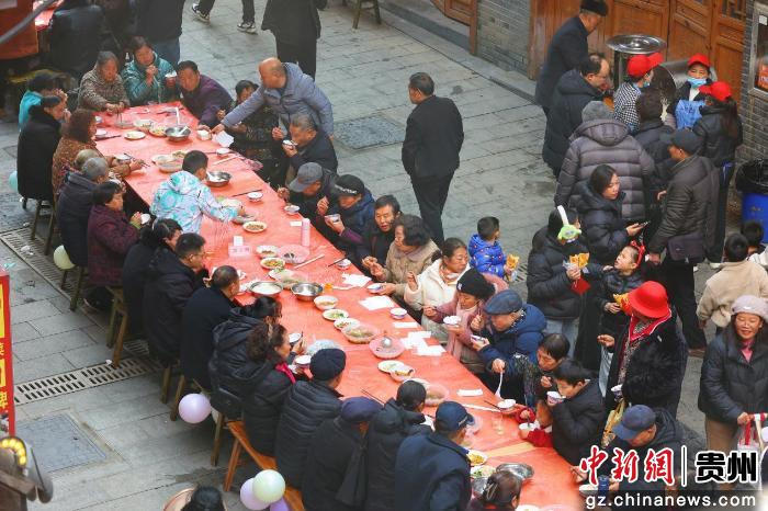 席间,身着盛装的苗族姑娘带来了原汁原味的苗族歌舞,银饰叮当声与欢快的旋律相映成趣;极具民族特色的“高山流水”敬酒仪式更是将氛围推向高潮,八位苗族姑娘手持酒具梯次排开,米酒如瀑布般层层流淌至宾客碗中,伴随悠扬的芦笙与祝酒歌,尽显苗家待客的热忱与豪迈。不少外地游客被这份热闹吸引,主动加入长桌宴,沉浸式感受遵义的年味与温情。