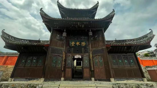 这里的主建筑为封闭式四合院,“品”字形砖木结构,坐南向北,一正两横,中轴线对称,轴线上依次为门厅、两厢、天井、正堂,四面均为青砖砌筑的围护墙体,大门额横排楷书“务本堂”三字。