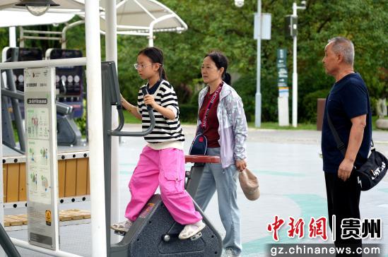 图为8月22日,市民在贵阳市观山湖公园体验健身器材。石小杰摄