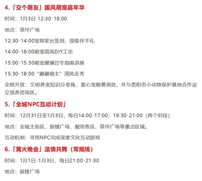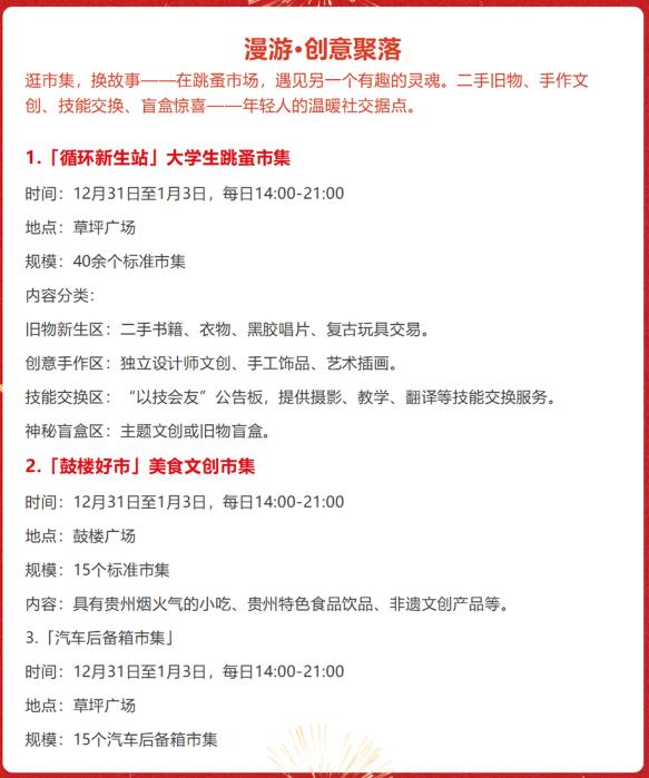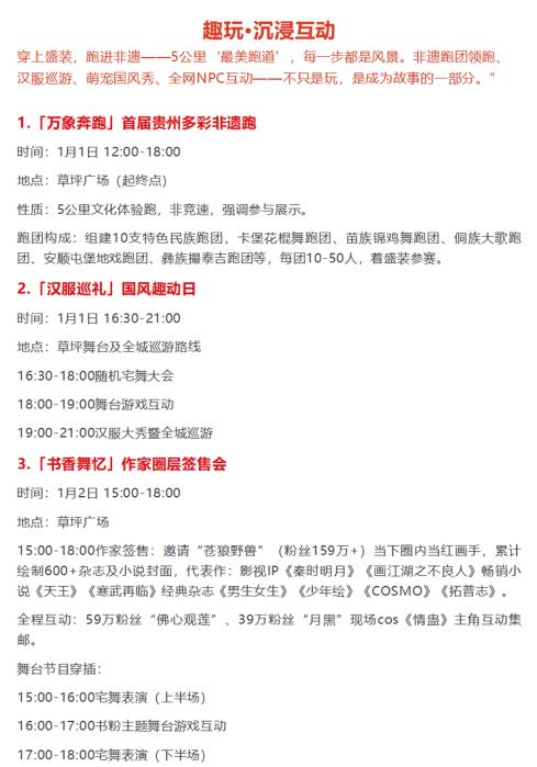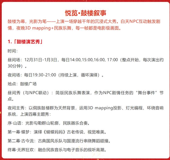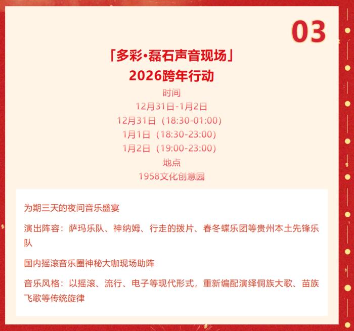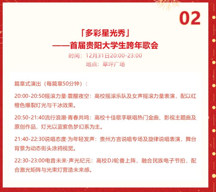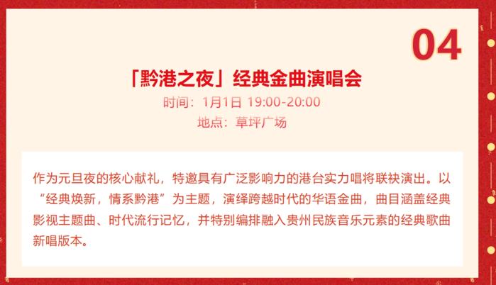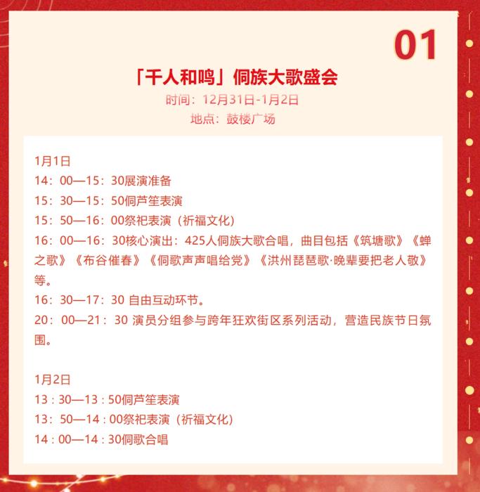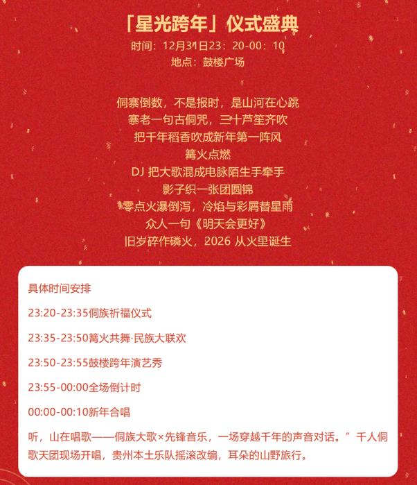 本次活动以“千山和鸣·万象更新”为主题,将举行星光跨年仪式盛典、千人和鸣侗族大歌盛会、多彩星光秀——首届贵阳大学生跨年歌会、多彩·磊石声音现场2026跨年行动、黔港之夜经典金曲演唱会、鼓楼演艺秀、循环新生站大学生跳蚤市集、鼓楼好市美食文创市集、万象奔跑首届贵州多彩非遗跑、汉服巡礼国风趣动日、书香舞忆作家圈层签售会、交个萌友国风萌宠嘉年华、全城NPC互动计划、篝火晚会温情共舞等系列活动。