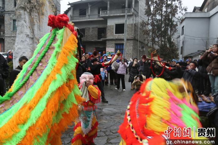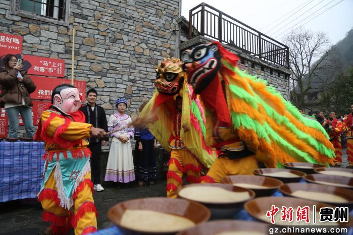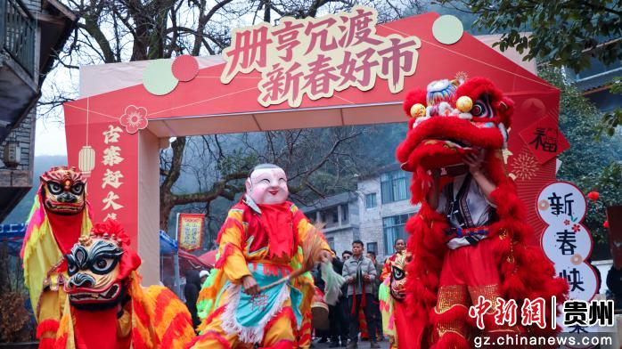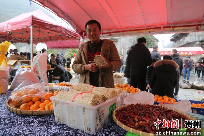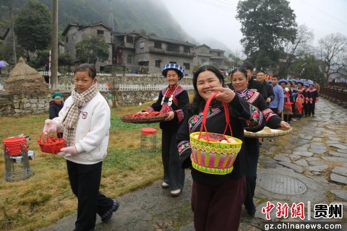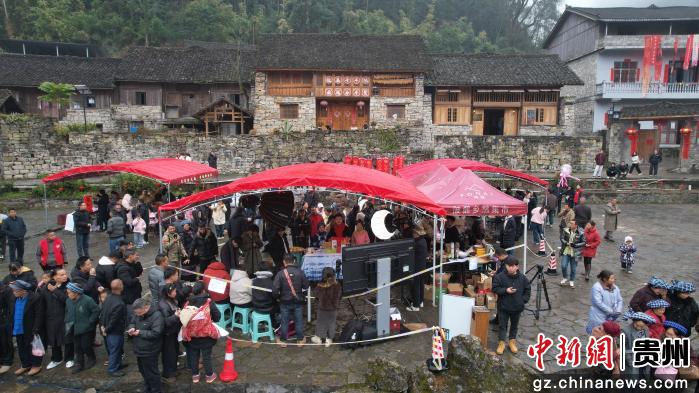 春节将至,贵州省册亨县在陂鼐古寨举行“迎新春·年货节”活动,附近村寨村民带上腊肉、蔬菜、水果、土鸡蛋等农特产品参加,古寨村民身着盛装,用美酒、唢呐、狮舞、庖汤肉等迎接各地嘉宾。当天还举行非遗项目游古寨、发放红包和云上年货推销活动,浓浓年味溢满整个古寨。(叶方杰)