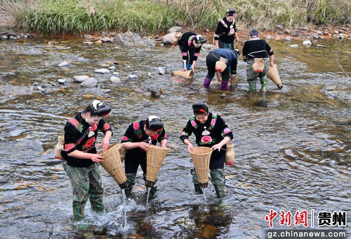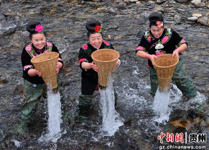 贵州省黔东南苗族侗族自治州台江县南宫镇交密村翁密河浅水区,苗族妇女在展示苗族民俗活动“倒鱼”。