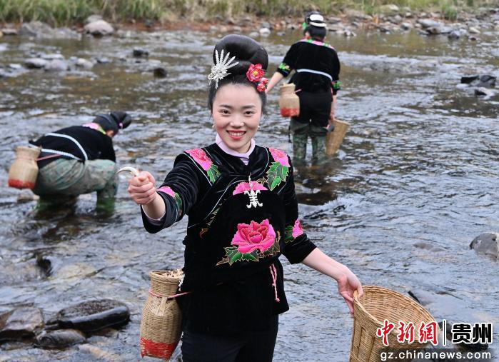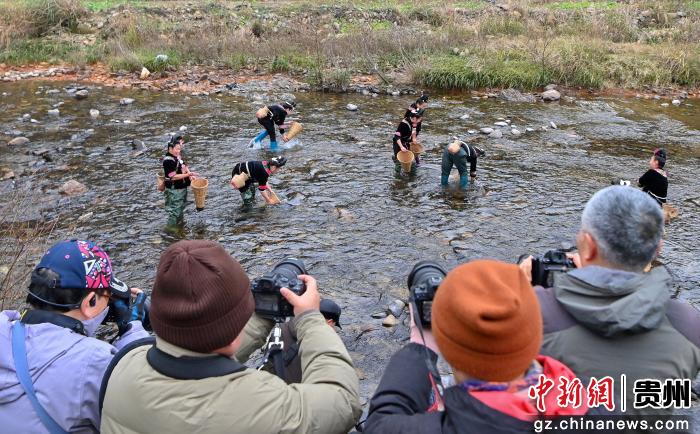 游客在贵州省黔东南苗族侗族自治州台江县南宫镇交密村翁密河畔观看苗族“倒鱼”民俗活动展示。