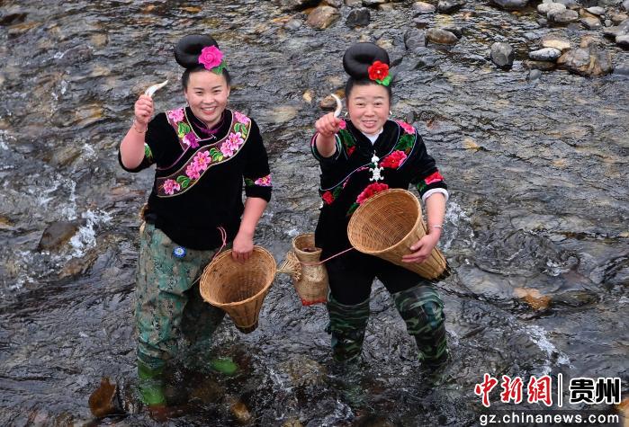 贵州省黔东南苗族侗族自治州台江县南宫镇交密村翁密河浅水区,俩苗族妇女在“倒鱼”民俗活动展示中抓到了一条小鱼。
