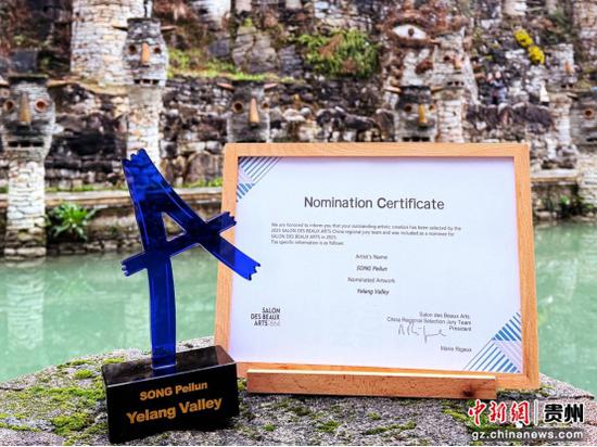 中新网贵州新闻2月11日电 (记者 张伟)贵州艺术家宋培伦日前收到法国巴黎国际艺术沙龙展组委会寄来的奖杯和证书,其作品《夜郎谷》荣获2025年法国巴黎国际艺术沙龙展提名奖。