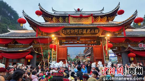 在剑河仰阿莎温泉小镇,苗族同胞正在盛情迎接各民族“村T少年”。剑河县融媒体中心供图