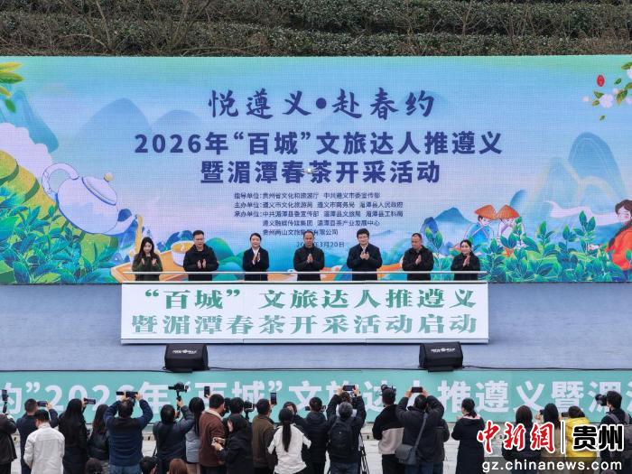 中新网贵州新闻3月20日电(唐超)“悦遵义・赴春约”2026年“百城”文旅达人推遵义暨湄潭春茶开采活动20日在遵义市湄潭县永兴茶海广场举行。活动旨在推动遵义旅游从“景点旅游”向“全域旅游”“季节性旅游”向“全时旅游”跨越,进一步提升“悦遵义”文旅品牌影响力。