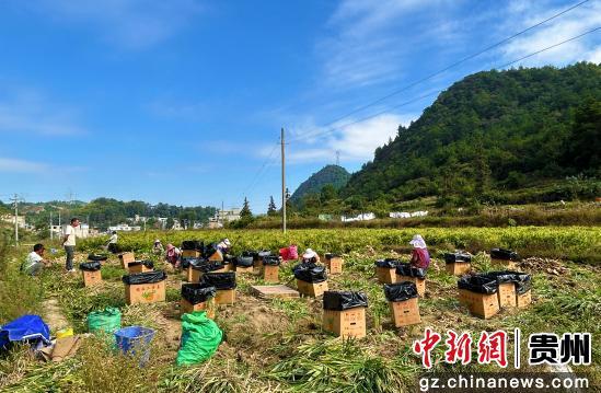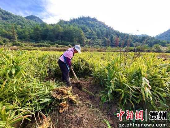 中新网贵州新闻11月12日电(尹美玲)连日来,贵州省惠水县濛江街道民河村30余亩生姜迎来大丰收。姜田里,村民们正弯着腰挖姜、清理泥土、堆晒剪叶、装箱封箱……一派繁忙的丰收景象。