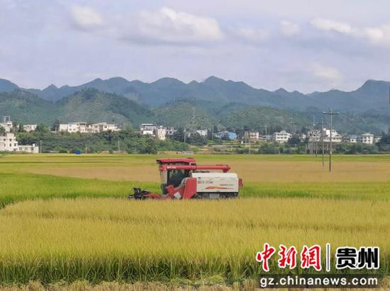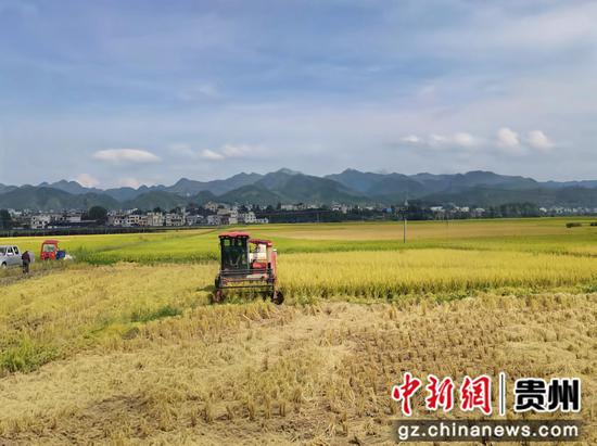 在惠水县好花红镇,万亩稻田披上“金装”,联合收割机在田间往来穿梭,轰鸣声与农户的笑声交织,一幅机械化助农丰收的热闹图景。