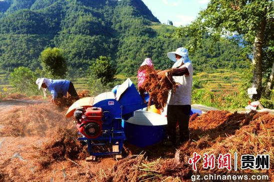 中新网贵州新闻9月17日电(张银川 杜黔军 杨洪)金秋时节,贵州沿河土家族自治县客田镇的大地上仿佛打翻了大自然的调色盘,高粱和辣椒激荡出赤浪滚滚的“红”、烤烟与稻谷渲染出金光熠熠的“黄”、饲草同青蒿泼洒出生机勃勃的“绿”,“红黄绿”三色交融,不仅点缀了乡村的田野,更交织出农户们脸上藏不住的喜悦。