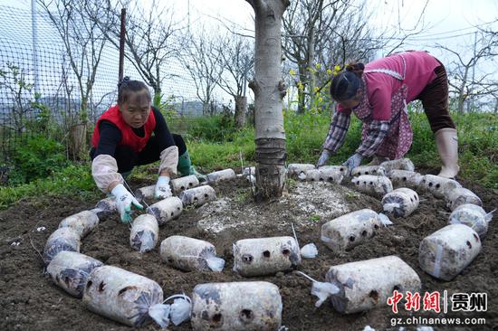 中新网贵州新闻3月18日电(龙再刚 王敏 侯博文)春分将至,农事渐浓。在长顺县广顺镇南场社区国有林场和广农苹果种植园,工人们正在挖菌床、摆放菌棒和天麻种、覆土。。。。。。随处可见忙碌的身影,数十名村民分工协作、干劲十足,呈现出一幅生机盎然的春耕春种画卷。