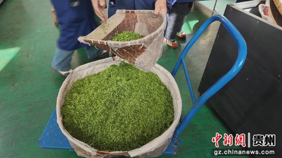随着头茬春茶的大面积开采,全县各茶叶加工企业也开足马力,进入了赶制新茶的关键时期。在雷山县苗家春茶业有限公司生产车间内,新采的茶青经过摊放、杀青后,工人们正熟练进行揉捻作业,标准化加工流程有序推进,确保鲜叶快速转化为品质上乘的春茶产品,让雷山生态茶香尽快走向市场。该公司制茶师潘丽菊透露,当天主要制作手工毛尖,茶叶是前一天下午五六点钟左右收回来的,先摊凉散去多余水分,次日早上杀青后放置回潮,之后再轻微揉捻让茶叶发软,再纯手工揉成卷曲的毛尖形态,烘干后静置一段时间,第二天还要经过高温提香的最后一道工序才能包装发货。