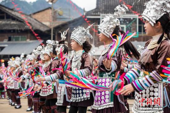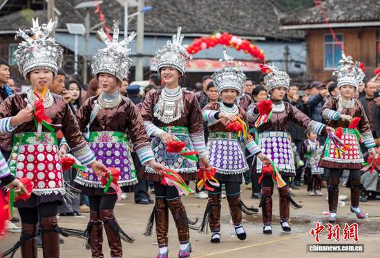 2月19日,贵州省黔东南苗族侗族自治州从江县刚边壮族乡银平村热闹非凡,村民们身着民族盛装,欢聚一堂,以吹奏芦笙、跳芦笙舞等传统习俗,欢庆新春。图为壮族群众盛装巡游。罗京来 摄