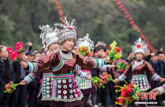 图为壮族姑娘在贵州省从江县刚边壮族乡银平村跳芦笙舞。罗京来 摄