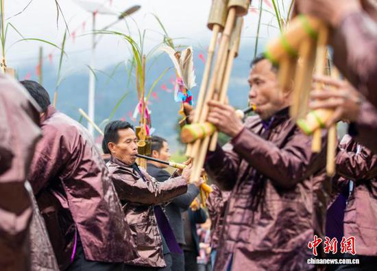 图为壮族群众在贵州省从江县刚边壮族乡银平村吹奏芦笙。罗京来 摄
