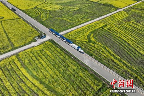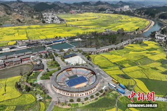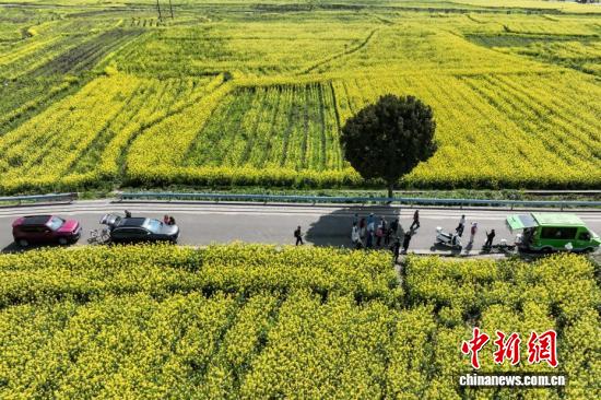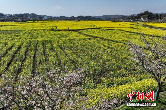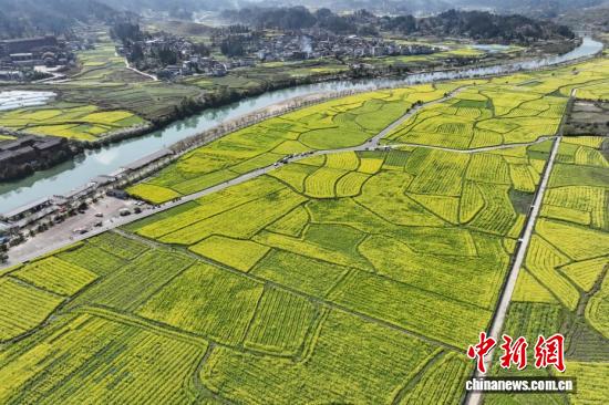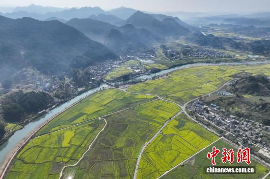 3月11日,航拍贵州省黔南州贵定县金海雪山景区的油菜花海与乡间小道、村庄、山林相映成趣,构成一幅美丽的春日画卷。(无人机照片)中新社记者 瞿宏伦 摄