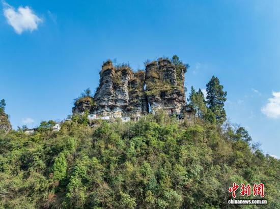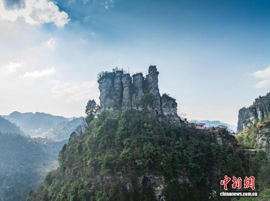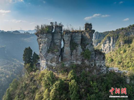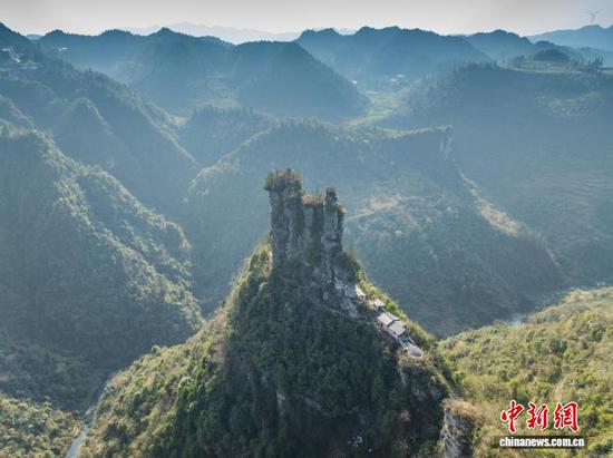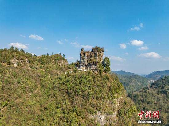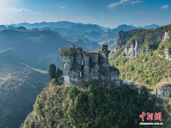 3月12日,航拍务川七柱山天然岩峰阵列景观。七柱山位于贵州省务川仡佬族苗族自治县黄都镇高洞村,历经亿万年风化侵蚀形成,七座岩峰整齐排列,景观独特。(无人机照片)唐哲 摄
