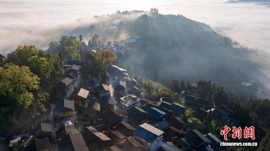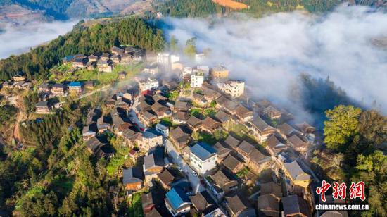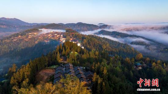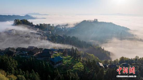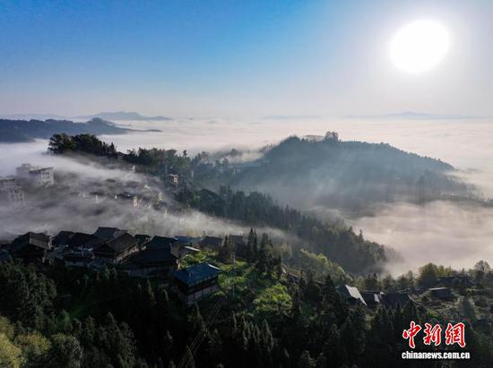 春日时节,贵州省从江县大塘苗寨晨雾缥缈,鳞次栉比的传统木屋与青山、田园、公路、云雾、朝阳相互交融,静谧而唯美。(无人机照片)吴德军 摄