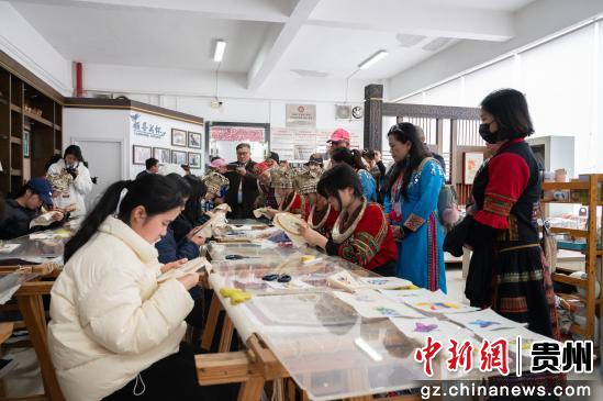 图为参访团在贵州盛华职业学院非遗刺绣实训室参访。唐哲 摄