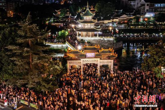 图为游客在贵阳市甲秀楼景区游览。 中新网记者 瞿宏伦 摄