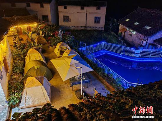 10月3日,游客在贵州省贞丰县平街乡花江村村民林国权的民宿院子内搭帐篷。(受访者供图)