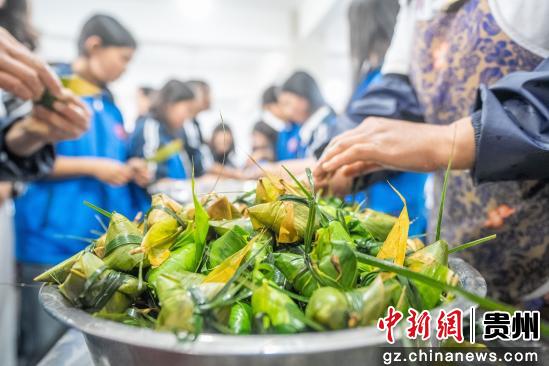 图为学校教师与爱心人士一起手把手教孩子们包粽子。