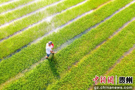 资料图:农民在贵州省黔西市洪水镇水稻秧田里为稻秧施肥。史开心 摄