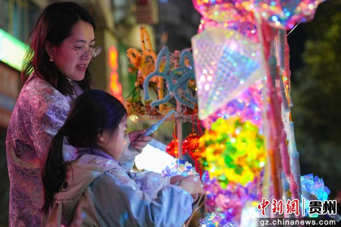 图为务川仡佬族苗族自治县2026年“马跃山河·都濡闹春”春节巡游活动现场,一名家长正在给小孩选购灯笼。申逸恺 摄