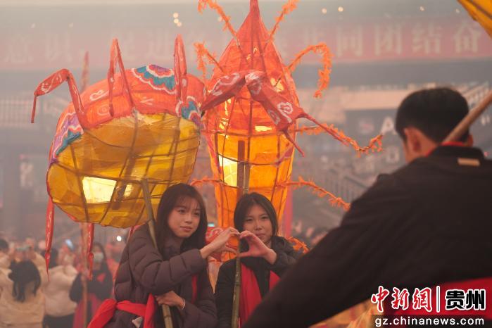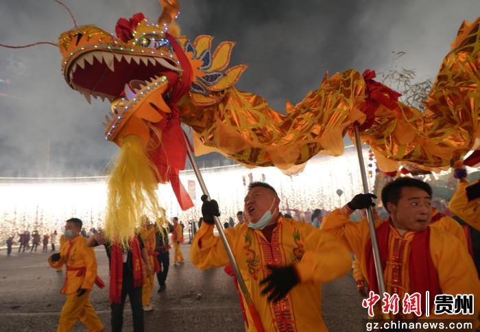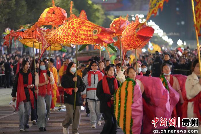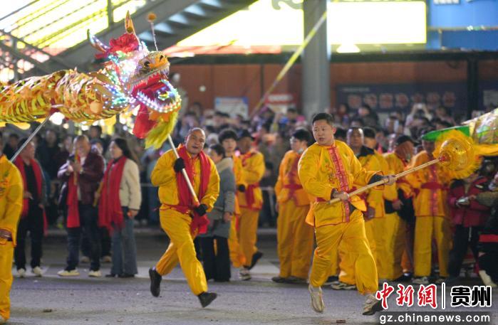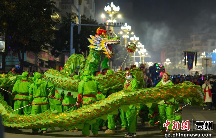 2月18日晚,贵州省遵义市务川仡佬族苗族自治县举办2026年“马跃山河·都濡闹春”春节巡游活动,舞龙、花灯、腰鼓等表演队伍穿梭街头,与群众热情互动,活动现场热闹非凡。