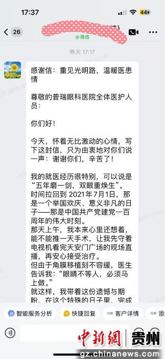 中新网贵州新闻4月15日电 贵州普瑞眼科医院日前收到了一封饱含真情的感谢信,写信人是角膜移植患者黄先生。信中,他深情讲述了自己五年间在该院完成双眼角膜移植、重获光明的经历,字里行间满是对医护团队的感激之情。