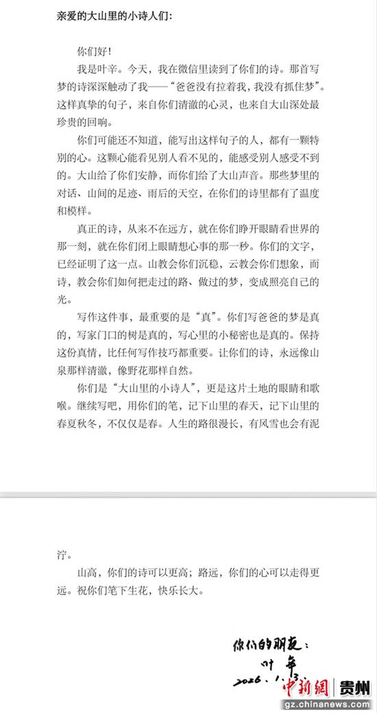 中新网贵州新闻1月19日电(谢明铭 杨新 邓邦英)“我从来没想过,我们的诗能飞到上海,还能得到叶辛爷爷的关注。原来‘诗’真的像一封信,能去到很远的地方,让更多人看见大山里的我们。”贵州省遵义市凤冈县凤岭街道石径完小学六年级学生双雪说。
