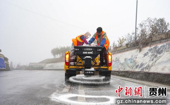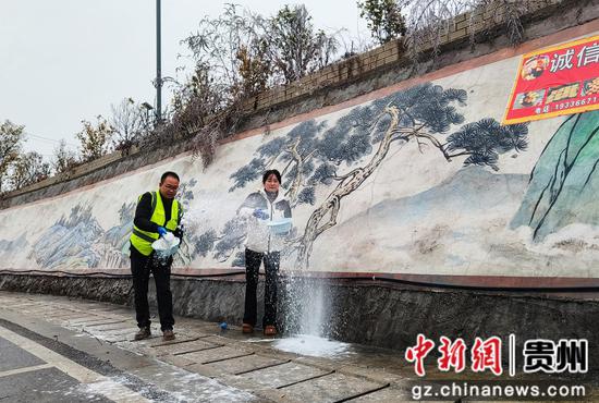 1月21日,贵州省毕节市纳雍县勺窝镇务井村山王庙,纳雍县交通运输局农村公路养护中心工作员在撒盐除冰。 杨英 摄