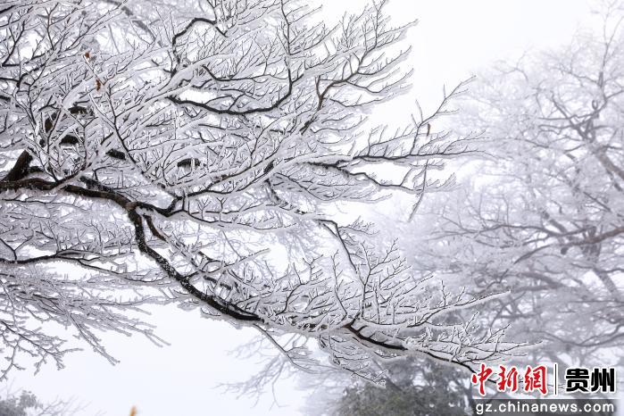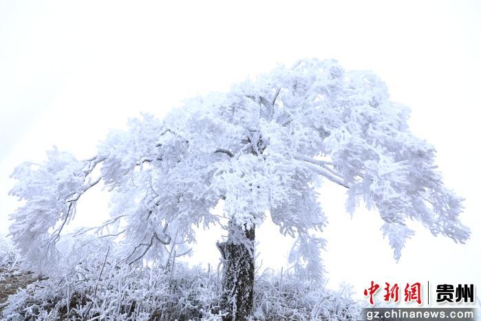 一夜寒风起,千树万树“银花”开。连日来受强冷空气影响,贵州剑河县老山界气温骤降,山间水汽在枝叶间悄然凝结,玉树琼枝、银松雪柳形成壮观的雾凇景观。