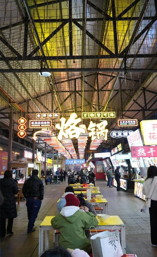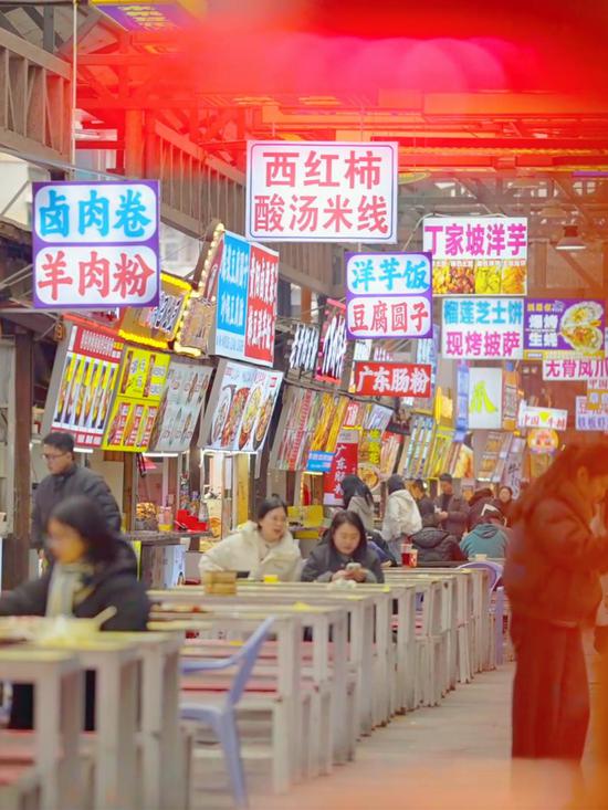 此次升级聚焦“视觉、业态、体验”三重焕新。在空间设计上,街区北门以贵阳甲秀楼为灵感,通过国潮美学重构传统街巷轮廓,霓虹灯带与中式建筑元素交织,成为市民游客打卡的“城市新封面”;业态布局进一步聚焦贵州本土风味,将南端区域调整为“烙锅主题区”,集中呈现这一贵州特色美食的制作技艺与用餐场景,实现“品类集聚 + 文化展示”双重价值。