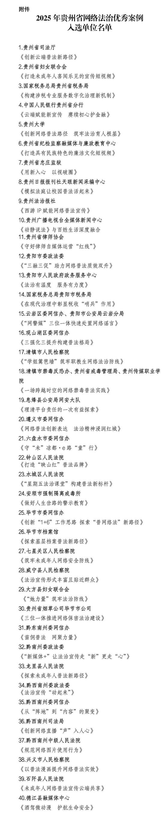 2025年贵州省网络法治优秀案例征集活动启动以来,得到了各单位和社会各界的广泛关注与积极参与,共收到案例108个,征集内容覆盖网络立法、网络执法、网络司法、网络普法等多个维度,全面梳理了近年来我省在网络空间法治化进程中的积极探索。