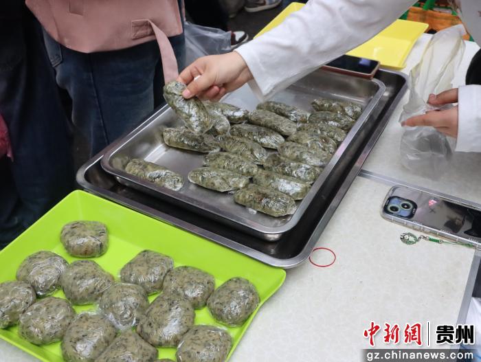 “我是从毕节黔西过来的,这些都是我自己采摘的毛香菜,纯手工做的。”小杨一边麻利地打包,一边介绍说。她口中的“毛香菜”就是当地制作清明粑的灵魂——鼠曲草。“我们管里头包的叫‘引子’,咸口的包了香菇、肉末、萝卜丝和豆腐丝;甜口的里面有核桃、芝麻、紫苏、花生。”