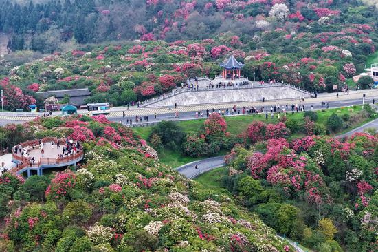 游客在贵州省毕节市百里杜鹃管理区普底景区赏花游玩。陈鹤摄