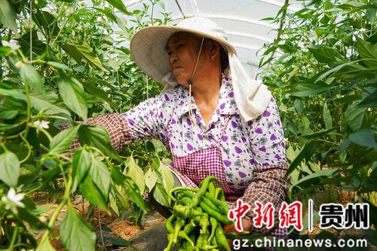 8月20日,在威宁自治县牛棚镇营上村蔬菜种植基地,务工群众在蔬菜大棚里采收辣椒。赵庆能 摄