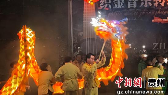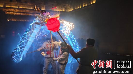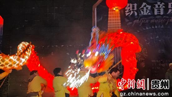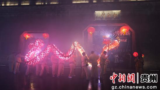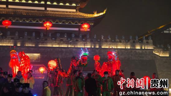 1月31日,织金县平远古镇永安门门口的舞龙表演。石小杰 摄
