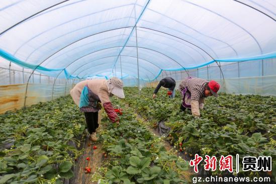 中新网贵州新闻2月8日电 (陈春志 刘虹艳 王娜)2月7日,尽管天空飘着细小的雪花,天气寒冷,但贵州省毕节市赫章县平山镇对江村的草莓大棚里却是一片繁忙景象。村民们正忙着采摘成熟的草莓,准备供应春节市场。